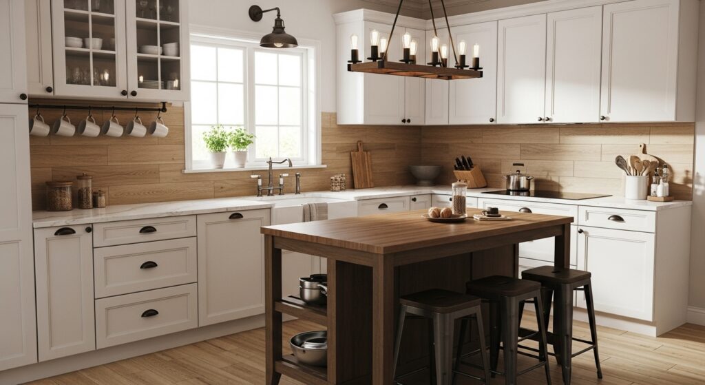 Wood-look tiles introduce warmth and a touch of rustic charm while keeping your kitchen easy to clean. They work beautifully with both modern and farmhouse white cabinet styles.