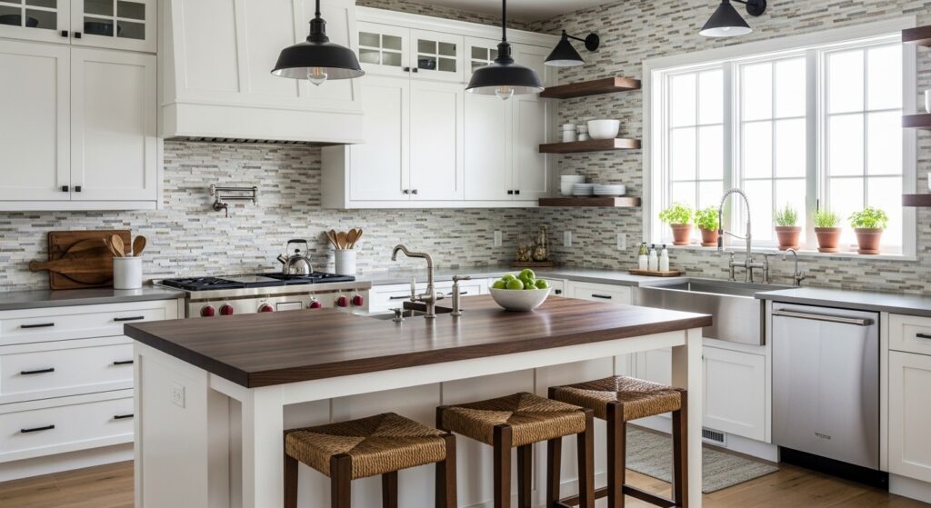 Subway tiles remain a top choice for white cabinet kitchens. Their clean lines and glossy finish create a timeless look that brightens any space. You can keep it simple with white-on-white or add interest with darker grout lines for a bold contrast.