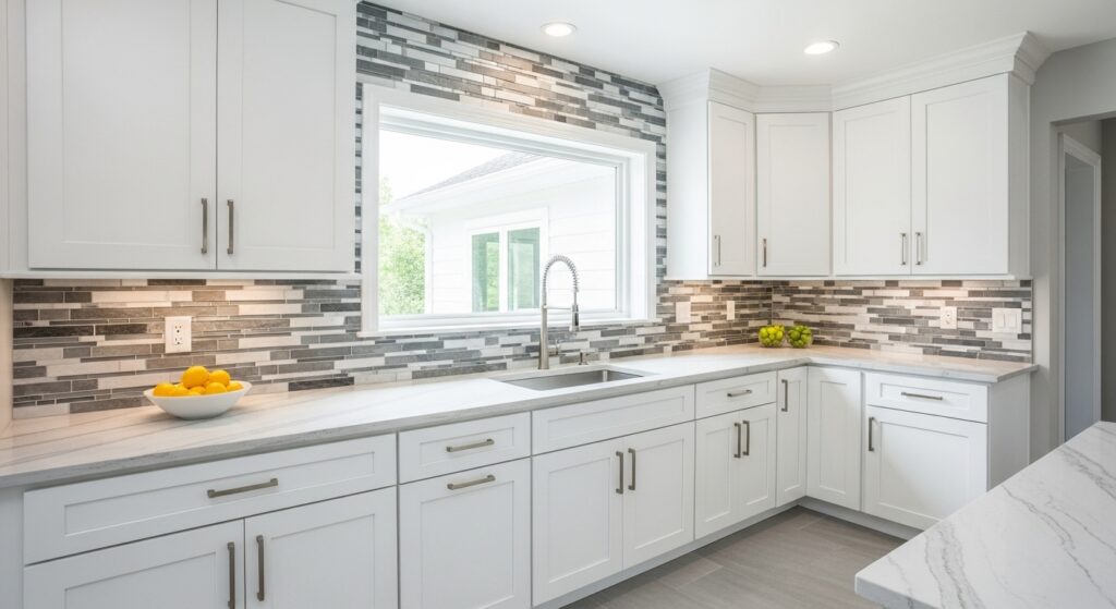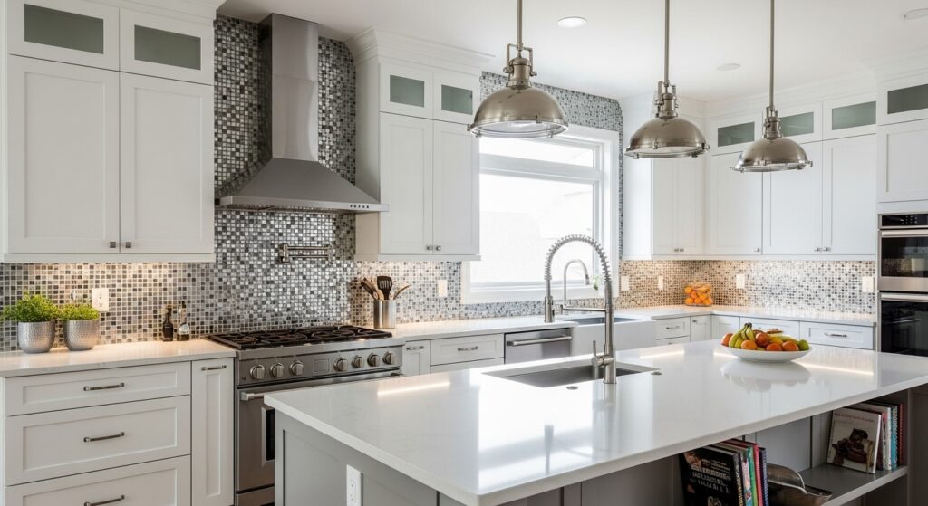 Mosaic tiles allow endless creativity—combine glass, ceramic, and metal pieces for a visually rich backdrop. This layered texture pairs perfectly with the simplicity of white cabinetry.