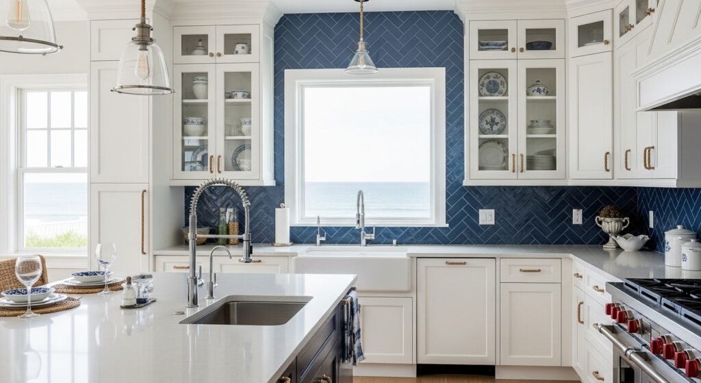 Blue tiles in a herringbone pattern bring coastal charm and a pop of color to white kitchens. The contrast between crisp white and soft blue feels both refreshing and timeless.