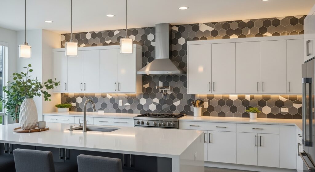 For a trendy and eye-catching update, geometric backsplashes are the way to go. Hexagon, chevron, or herringbone tiles can create striking movement and modern flair against crisp white cabinetry.