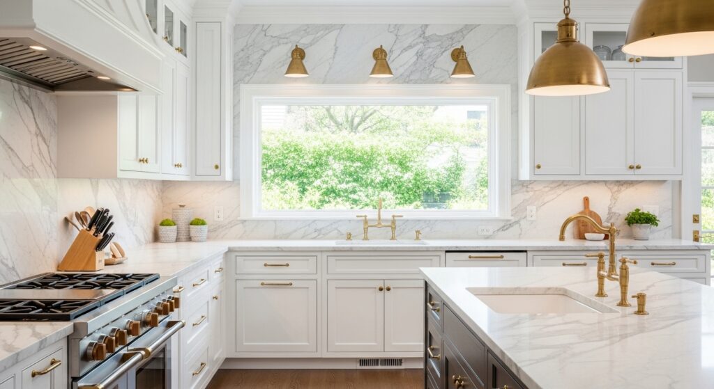 Marble backsplashes add a luxurious touch to your white kitchen. The natural veining of marble introduces texture and depth while maintaining a soft, sophisticated appeal. Pair it with gold or brass fixtures for a high-end finish.
