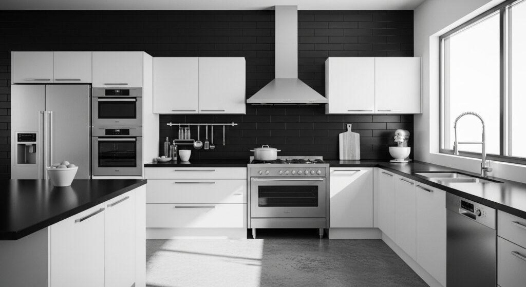 Black tiles against white cabinets create a dramatic, high-contrast look. Whether glossy or matte, black backsplashes add sophistication and modernity to your space.