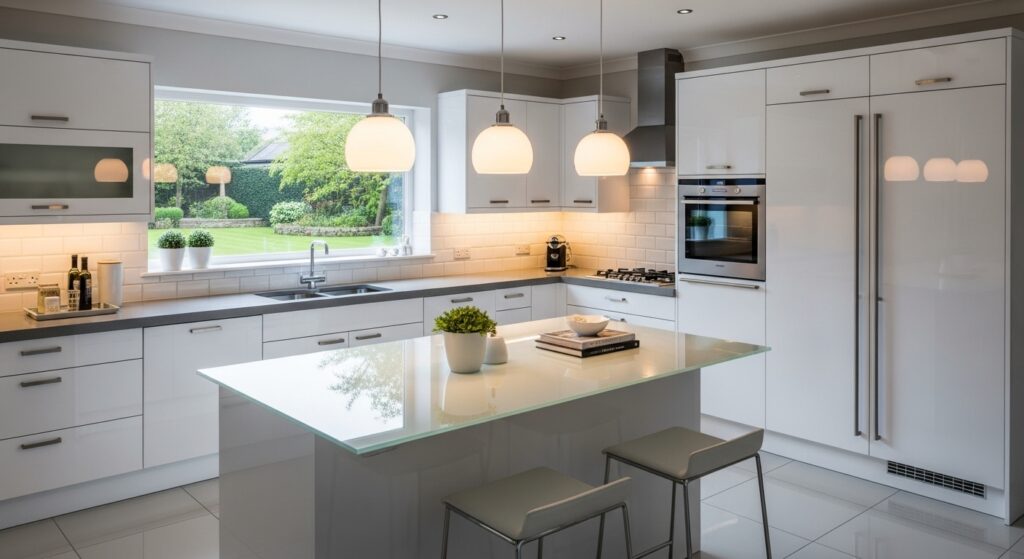A glass-top island brings a sleek, contemporary feel to the kitchen. It reflects light beautifully, making the space appear brighter and more open. Paired with an L-shape, the overall design feels both modern and functional.