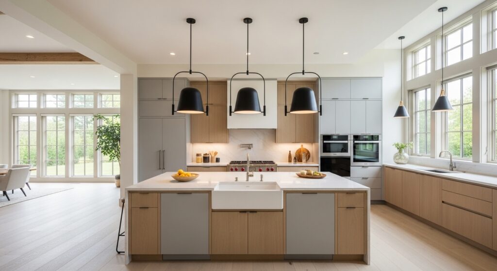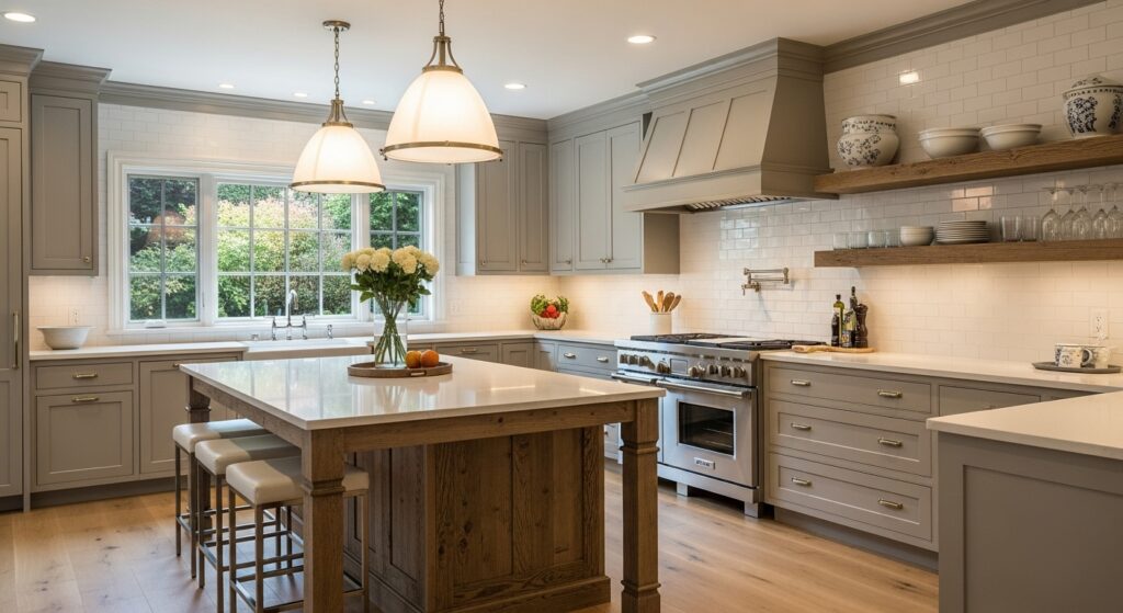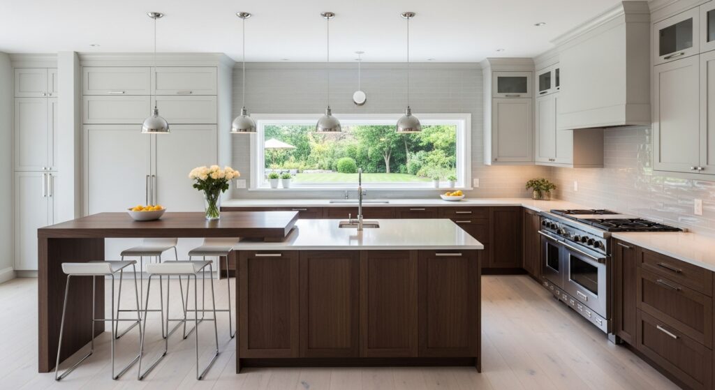 Transitional design blends modern and traditional styles, making it versatile and timeless. A mixed-material island — such as wood and quartz — creates visual depth and elegance. The surrounding L-shape ties everything together effortlessly.