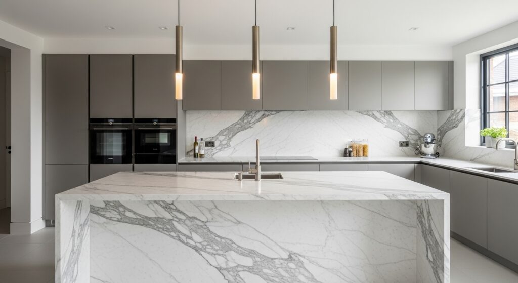 This layout is especially useful when you want your kitchen to function as a statement area. The waterfall feature becomes the star, while the L-shape keeps everything efficient and organized.