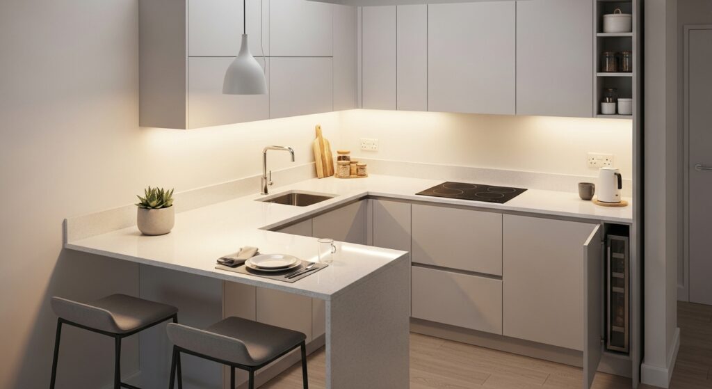 This design works especially well in apartments or small homes that need every inch to work smartly. Strategic cabinetry and slim appliances enhance the flow while keeping everything clutter-free.