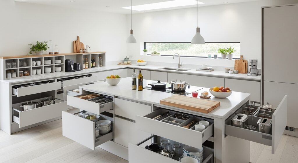 This layout helps maintain a clutter-free kitchen without sacrificing style. It’s ideal for families or anyone who loves keeping everything neatly organized.