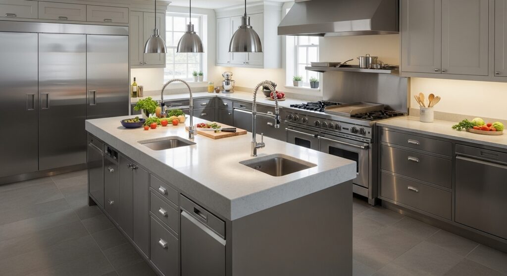 The island becomes the main workstation, ideal for chopping, plating, or entertaining guests while cooking. Paired with durable surfaces, it’s perfect for anyone who loves culinary creativity at home.