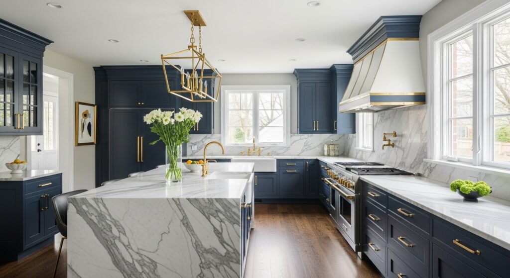 The spacious island supports both cooking and hosting, making it ideal for elegant entertaining. Accent lighting and gold or brass hardware elevate the overall look even further.