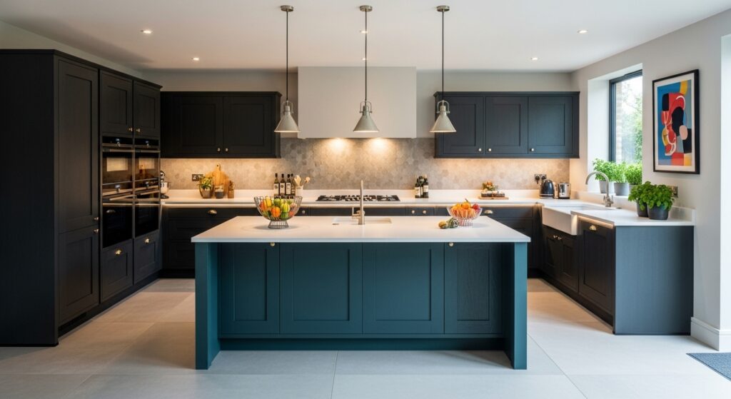 For those who want a bold look, a vibrant island color adds personality to an L-shaped layout. Whether it’s deep navy, emerald green, or striking black, the island becomes a focal point that elevates the entire kitchen.
