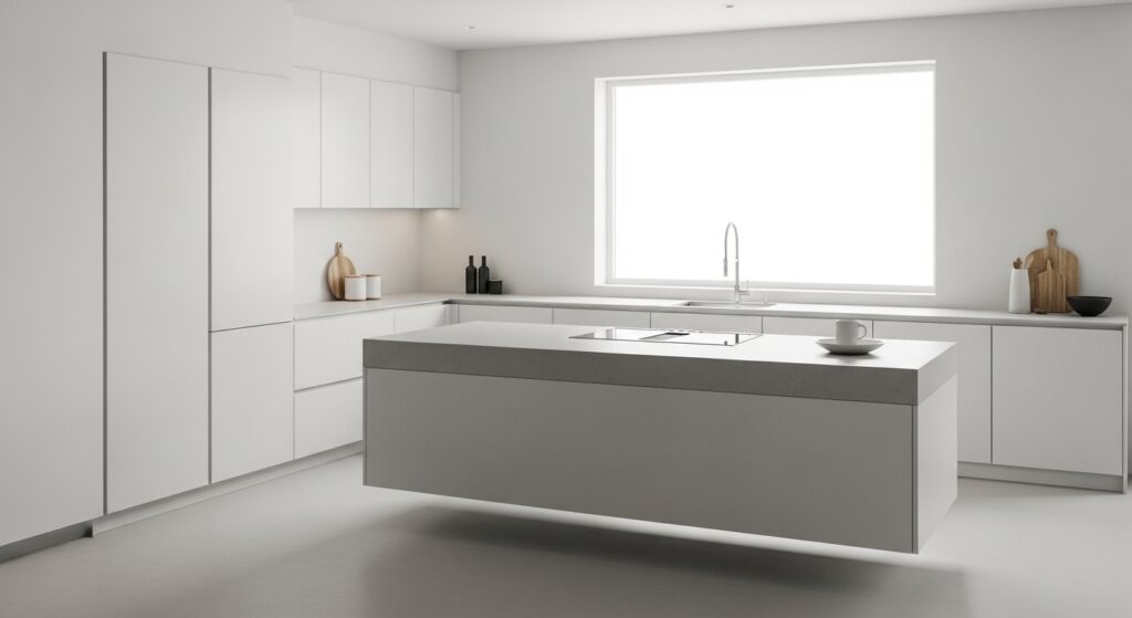 A minimalist design embraces clean lines, hidden storage, and a streamlined look. A floating-style island adds lightness to the room, making it visually spacious. The L-shape supports workflow efficiency with its simple but functional layout.