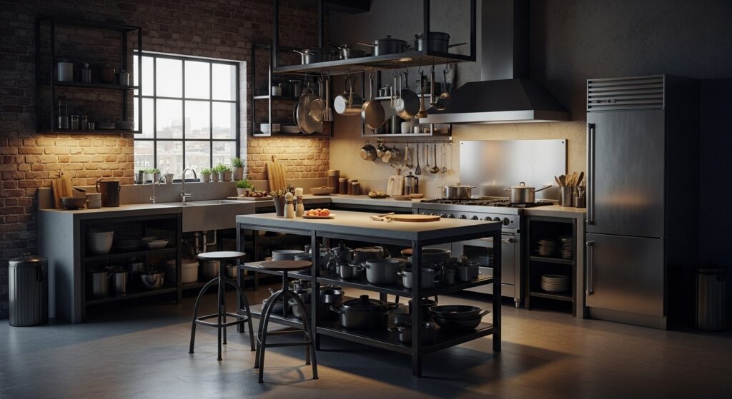 Industrial design incorporates rugged textures like exposed brick, steel, and concrete. A metal-framed island fits perfectly into this theme, giving the space an edgy, urban feel. The L-shape keeps everything functional and grounded.