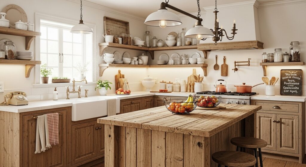 This layout blends functionality with timeless style. Rustic lighting fixtures, open shelving, and textured finishes add to the cozy, lived-in atmosphere. It’s perfect for farmhouse or country-style homes.