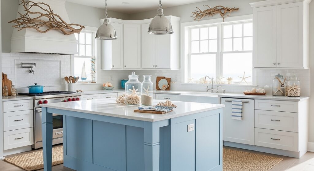 Natural textures like rattan, driftwood, or sandy-toned tiles enhance the seaside vibe. This setup is perfect for anyone wanting a lighthearted, relaxing kitchen design.
