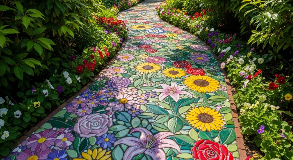 Add bursts of color with a hand-laid mosaic tile path. Use broken ceramics or colorful stones to create floral or geometric patterns that reflect your creative side.