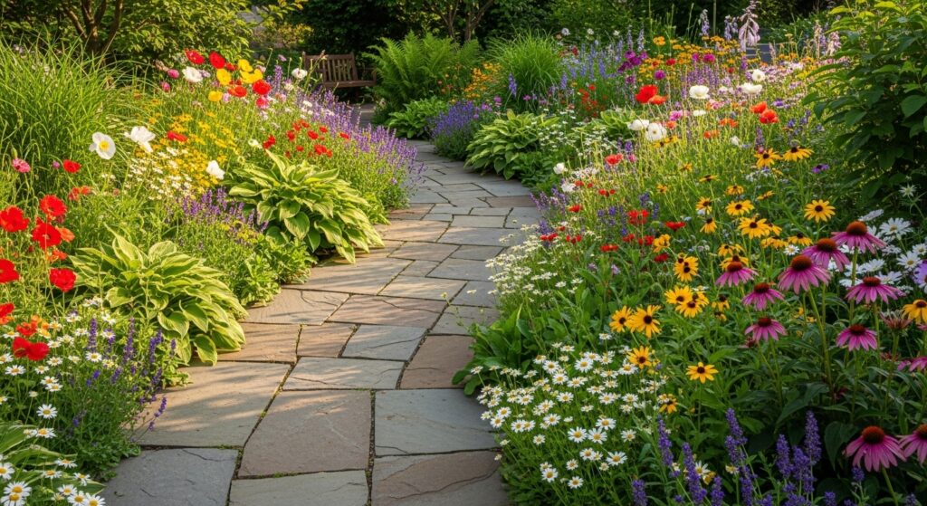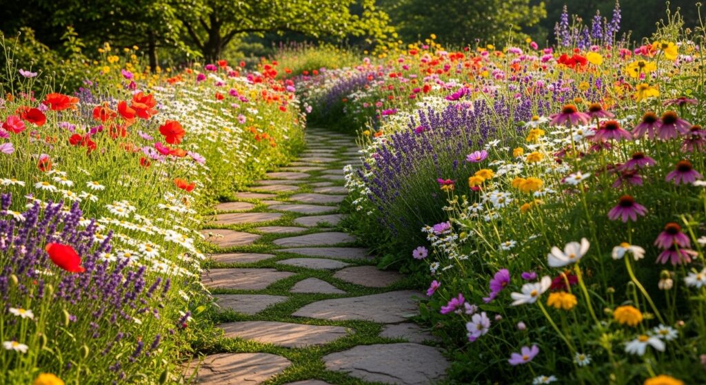 Let wildflowers frame your walkway with soft colors and textures. Daisies, lavender, and chamomile add fragrance and a carefree boho look.