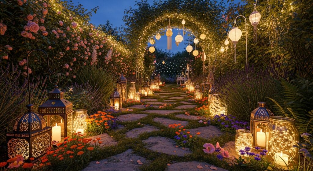 Line your garden path with fairy lights or lanterns for nighttime magic. The warm glow turns your walkway into a dreamy bohemian escape.
