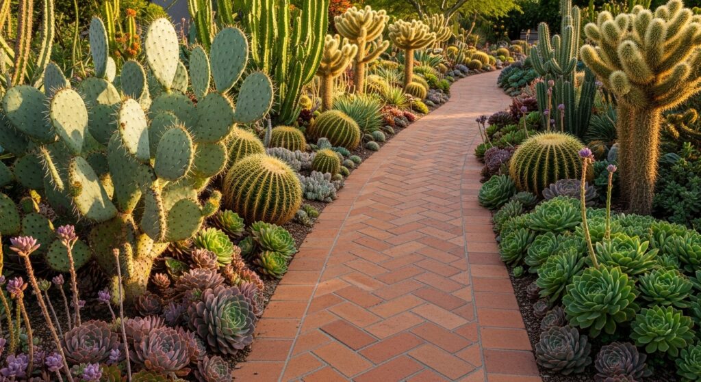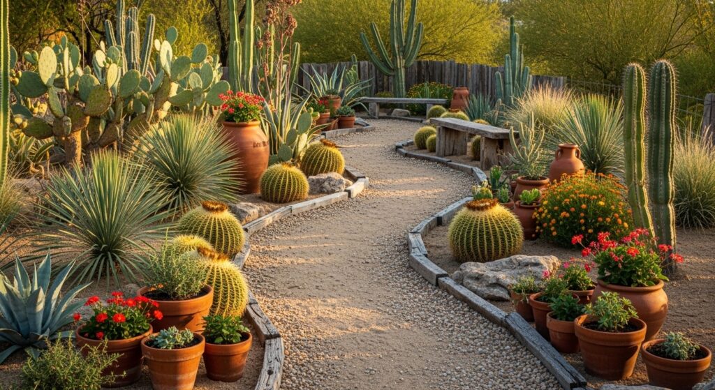 Combine sand, gravel, and cacti to create a Southwestern-inspired path. Add terracotta pots and macrame plant hangers for a desert boho aesthetic.