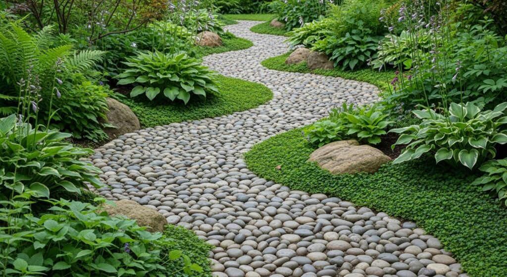 Use smooth river stones to form a flowing, organic path. Their natural shapes and shades of gray and tan bring harmony to your outdoor space.