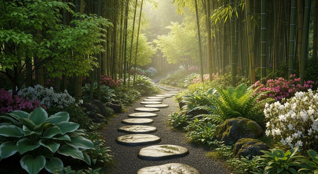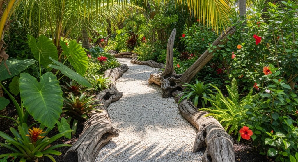 Lay bamboo planks or logs for a serene, zen-inspired path. It adds warmth and texture — ideal for tropical gardens or spaces with lots of greenery.