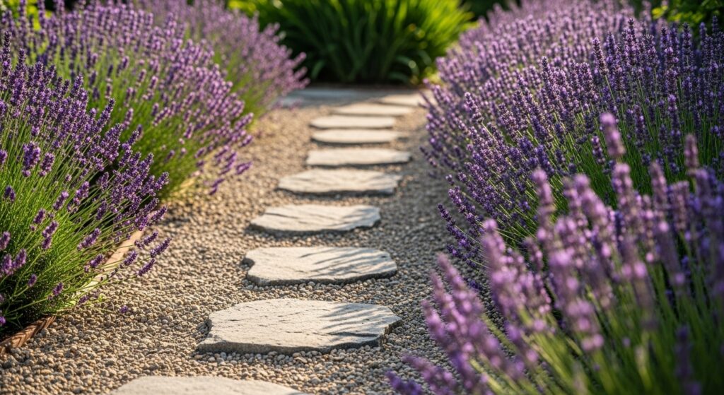 Mix smooth gravel with large stepping pavers for a textured, layered effect. Surround the edges with lavender or ornamental grasses for an effortlessly relaxed style.