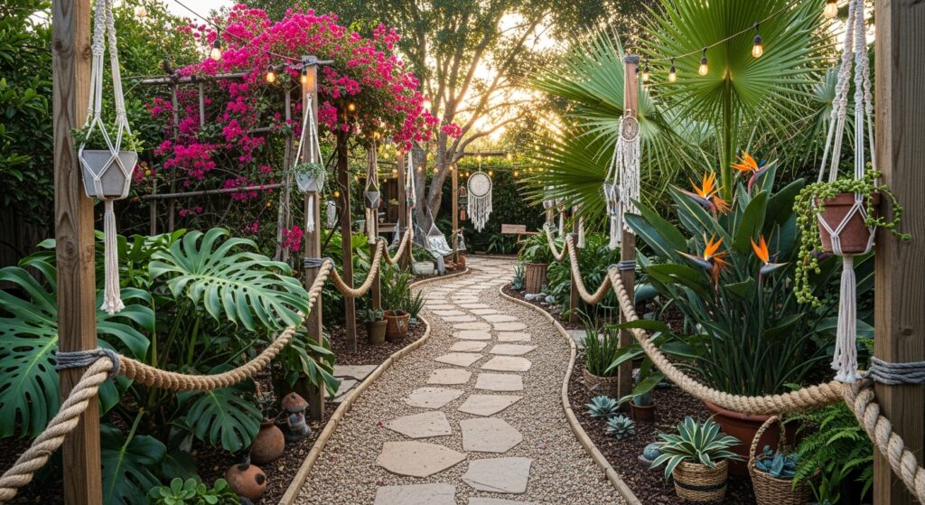 Use thick jute rope or driftwood logs to border your garden path. The natural materials add an earthy texture that complements boho decor beautifully.