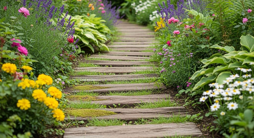 Lay wooden slices or planks across the grass to create a cozy, earthy walkway. The natural tones of wood blend beautifully with surrounding greenery, giving your garden a warm, bohemian charm.