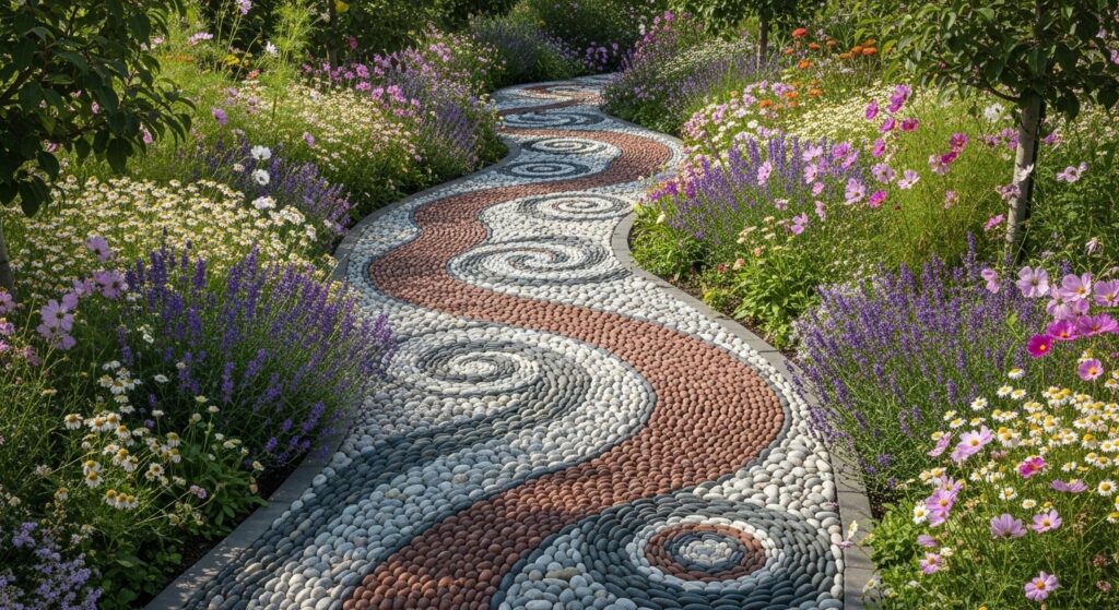 Create a stunning boho path using pebbles arranged in swirling, organic patterns. Use white, gray, and brown stones to create contrast and flow. This design feels both natural and artistic — perfect for barefoot strolls.