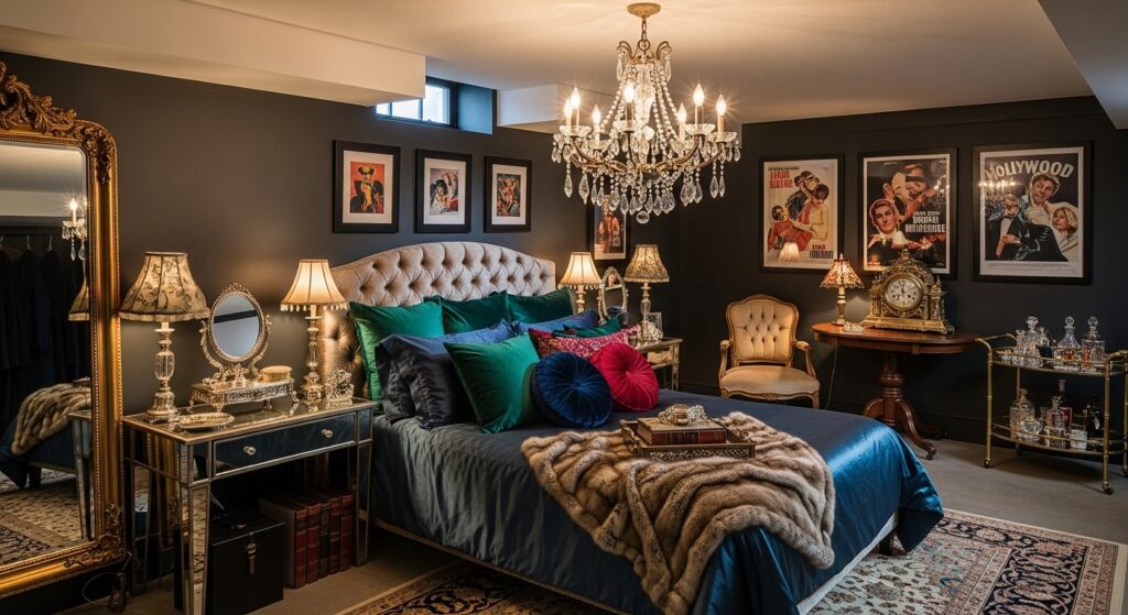Mix old Hollywood glam with vintage furniture and rich fabrics. A DIY chandelier and velvet cushions add luxurious appeal without exceeding your budget.