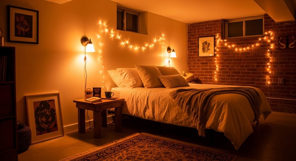 Lighting can completely change your basement’s mood. Use fairy lights, wall sconces, or LED strips to brighten and soften the space for a welcoming, restful ambiance.