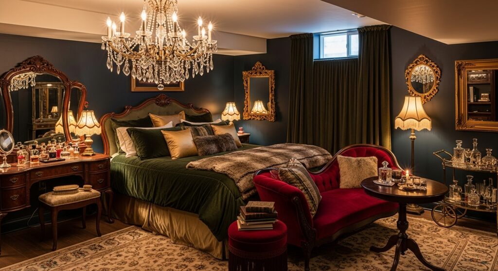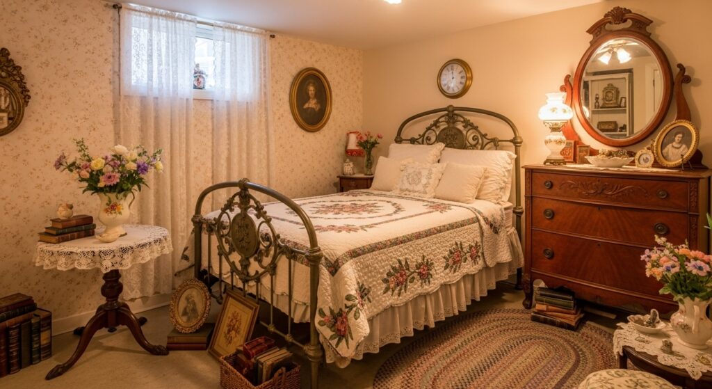 Transform your basement into a dreamy vintage escape with lace curtains, floral bedding, and antique-inspired furniture. Add warm lighting and candle decor to complete the timeless romantic look.