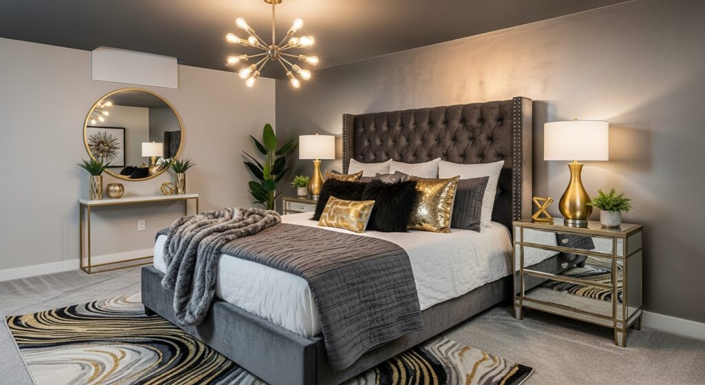 Achieve a hotel-inspired look by adding a tufted headboard, silky bedding, and gold or chrome decor pieces. DIY wall molding can give your space an upscale touch without the cost.