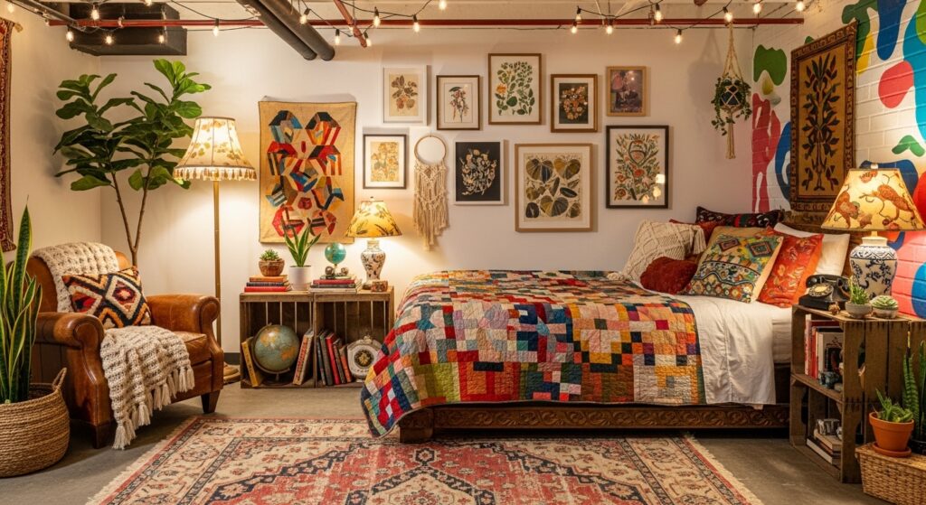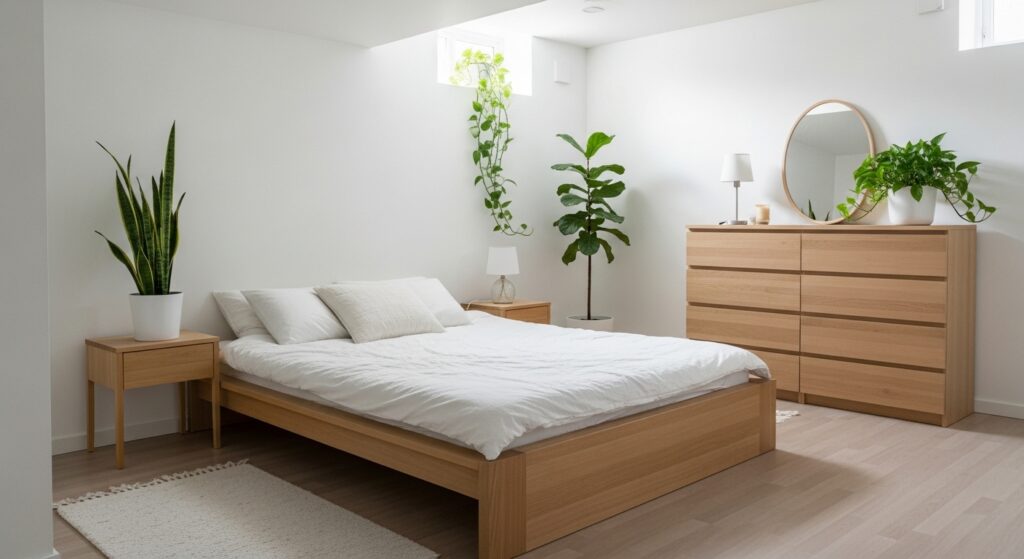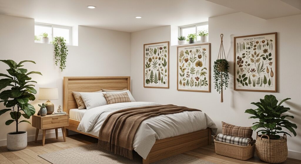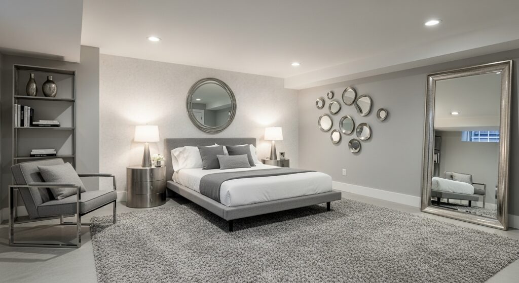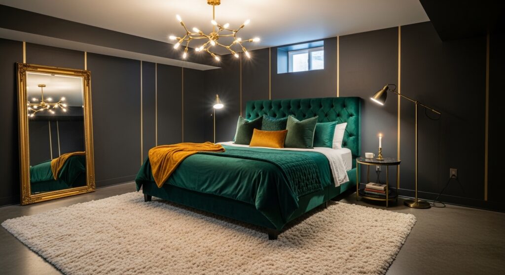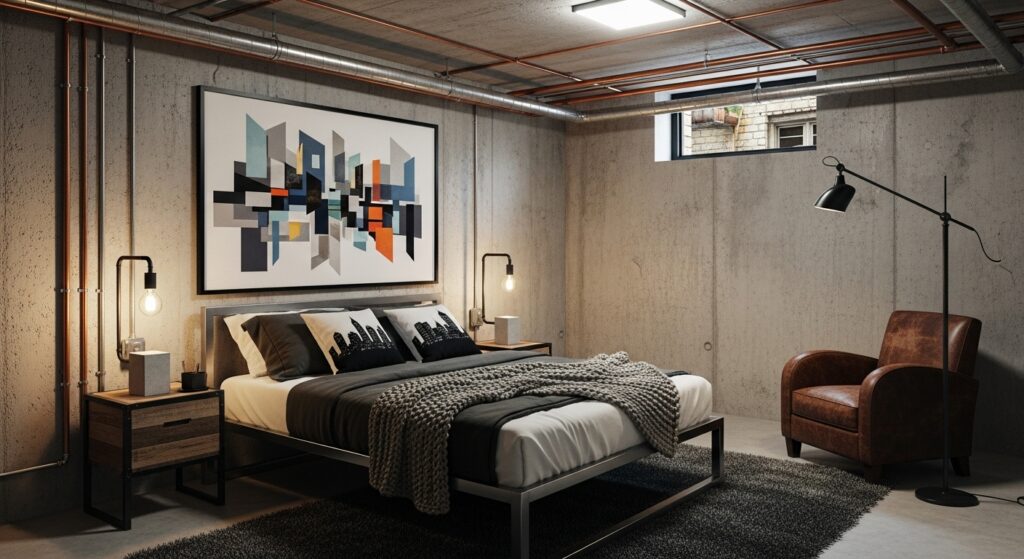 Think exposed pipes, metal shelving, and neutral tones. Add an oversized mirror or art piece for a contemporary statement. Industrial decor gives a basement bedroom an urban apartment flair.