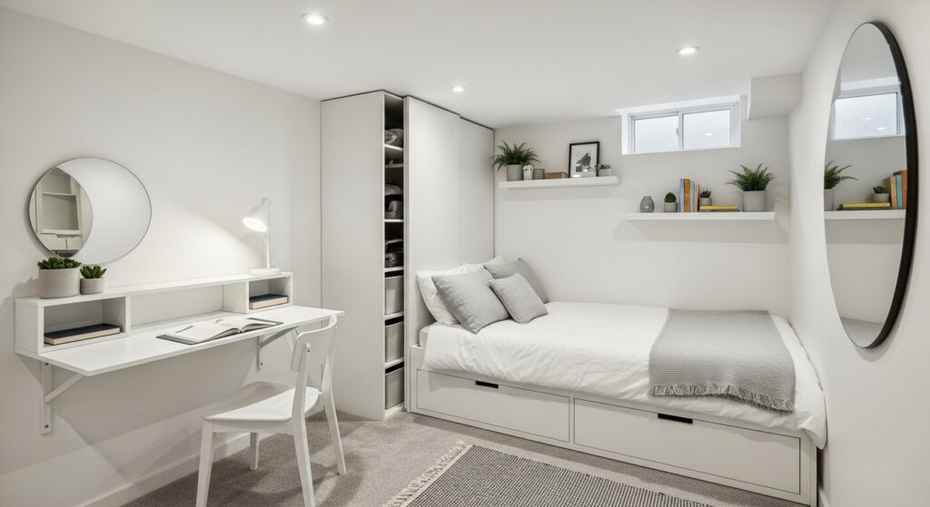 Maximize a small basement using multifunctional furniture like beds with storage drawers or foldable desks. Keep colors light to visually expand the room.