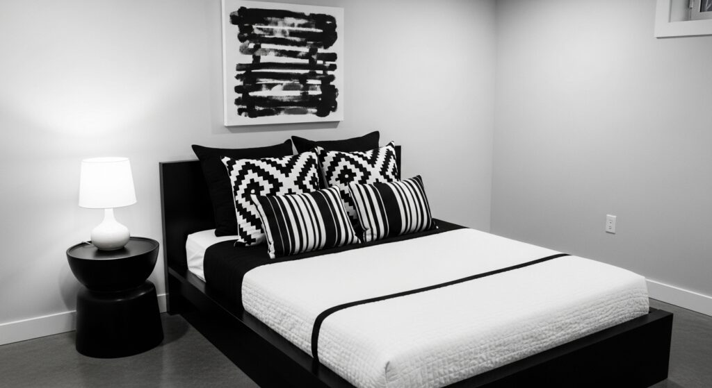 Stick to a timeless black-and-white palette for a clean, chic look. Add framed art or patterned cushions for personality while keeping the overall vibe sleek and stylish.