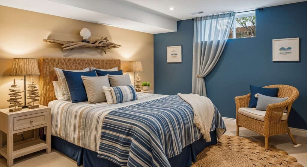 Use sandy tones, light blue hues, and wicker details for a coastal-inspired retreat. Add seashell art or driftwood frames for a breezy, beachy touch that feels fresh and relaxing.