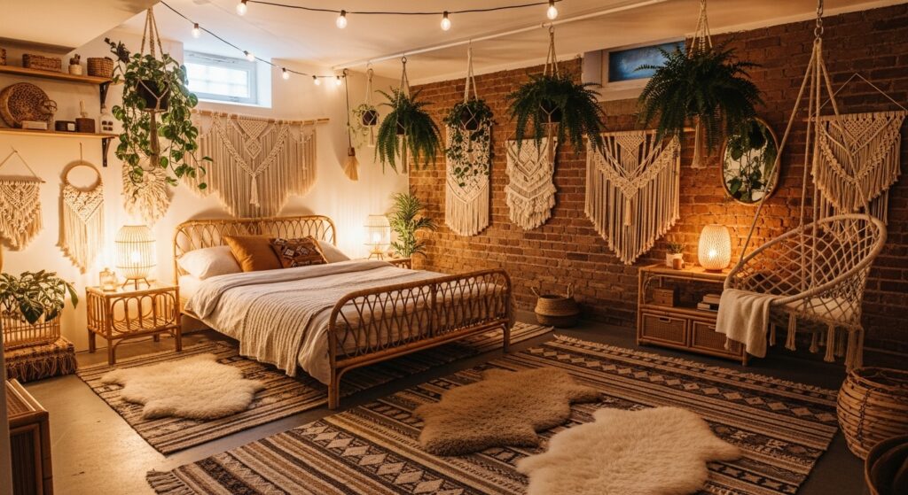 Layer rugs, textured throws, and rattan furniture for an effortlessly stylish boho look. Add hanging plants, macramé wall art, and soft lighting to create a relaxed retreat that feels far from a basement.