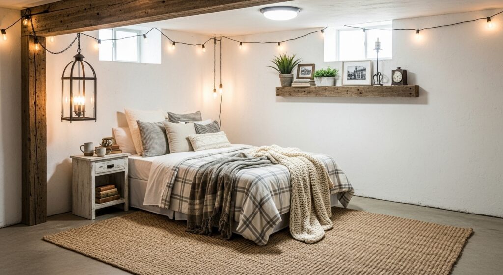 Turn your basement into a warm farmhouse-style retreat. Use reclaimed wood, whitewashed walls, and soft neutral tones to make the space feel bright and welcoming. A cozy plaid throw and vintage lighting instantly add charm without breaking the bank.