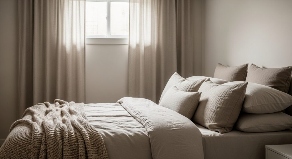 Use cream, beige, and taupe tones for a timeless, cozy space. Add layered fabrics like knit blankets and linen curtains to make the room feel naturally warm and inviting.