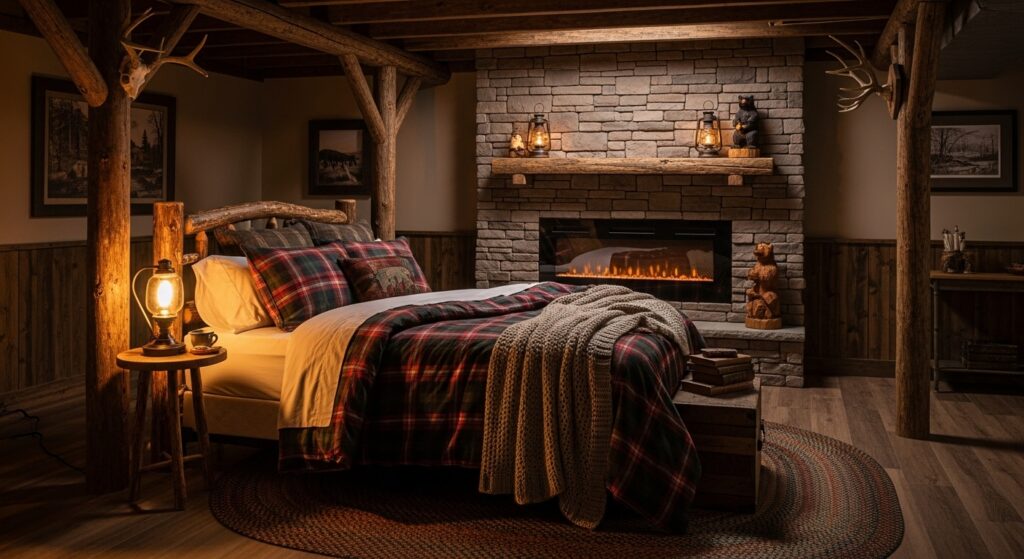 Bring nature indoors with warm wood accents, plaid bedding, and soft lighting. A faux stone wall or a DIY wooden headboard adds the perfect rustic touch for a cozy cabin escape right under your home.