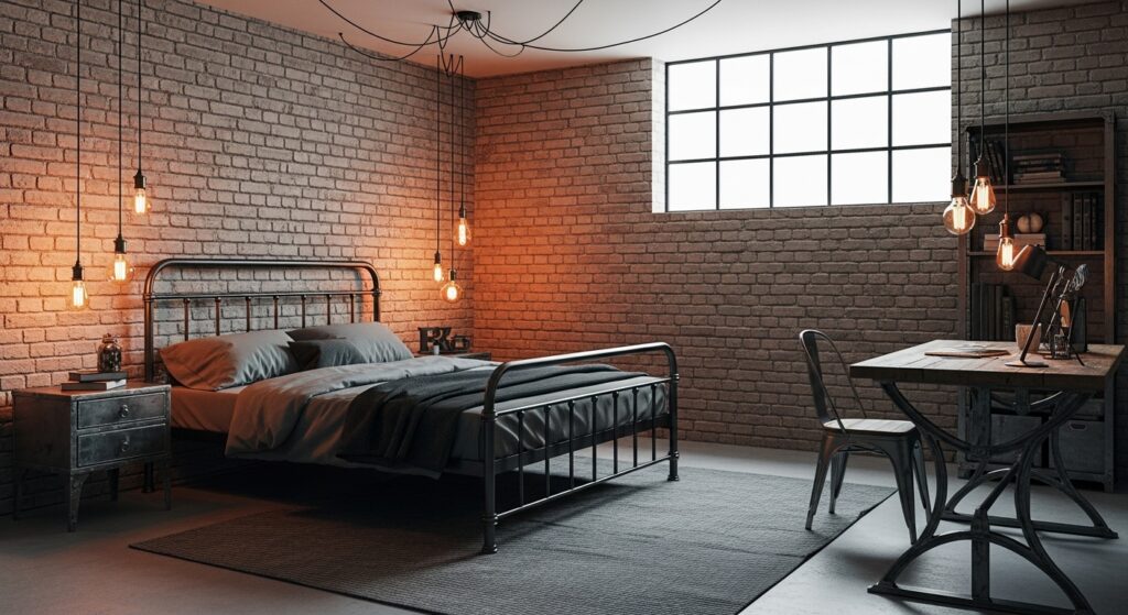 Combine raw materials like exposed brick wallpaper, black metal bed frames, and Edison bulb lights for an edgy yet sophisticated look. Keep the color palette simple with greys and browns to maintain that authentic industrial charm.