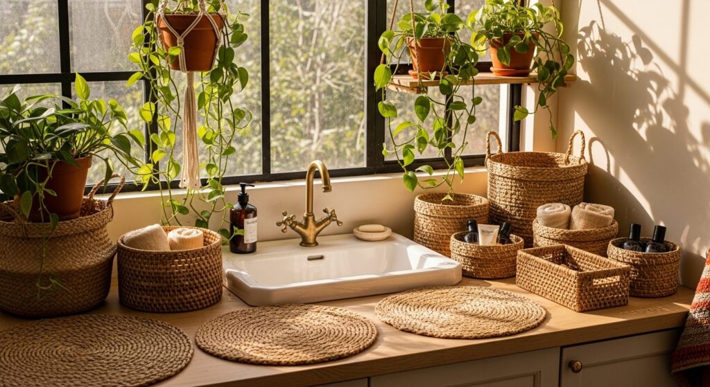 Frame your sink area with bamboo or rattan textures for a tropical bohemian retreat vibe. Add seashell or rope accents for coastal flair.