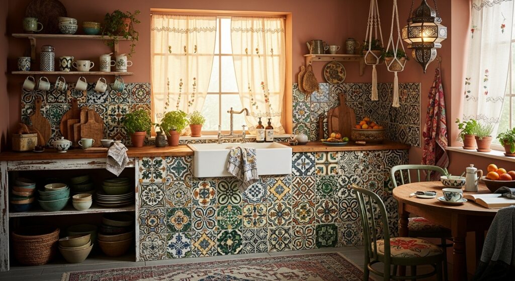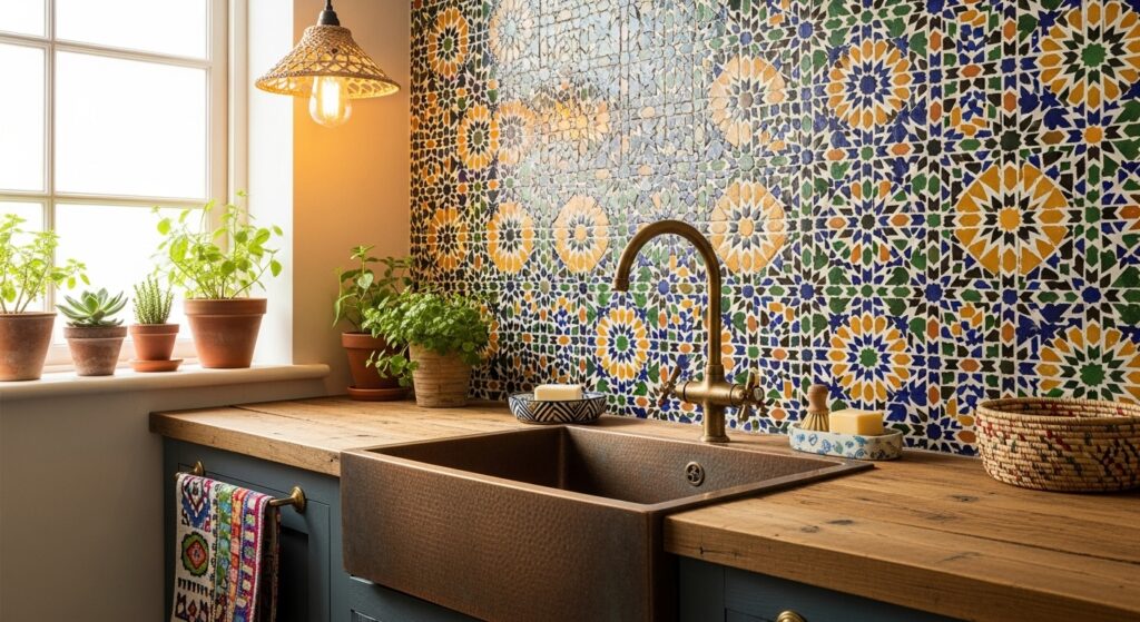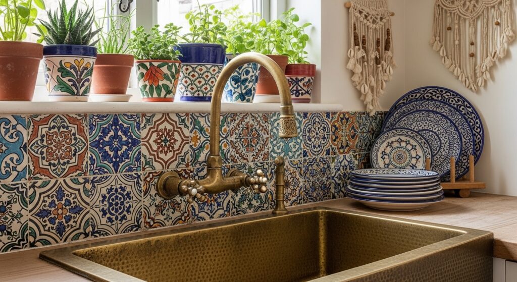 Vibrant Moroccan tiles around your sink create a mosaic masterpiece. The mix of indigo, terracotta, and mustard hues instantly transforms your kitchen into an artisan’s dream. The intricate geometric patterns embody traditional craftsmanship and storytelling through color.