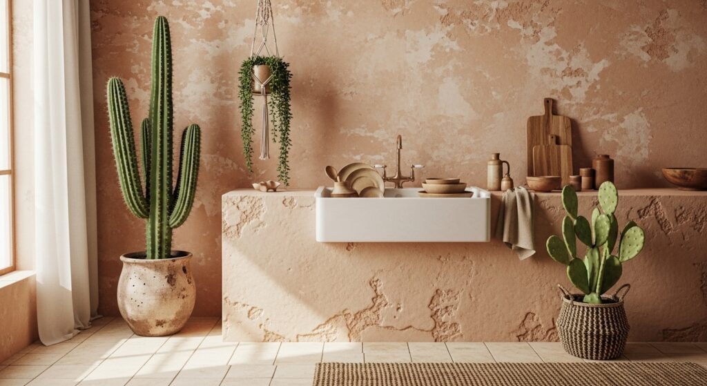 Think terracotta hues, woven textures, and sandy tones. A desert-inspired sink area captures warmth, calm, and minimalism.