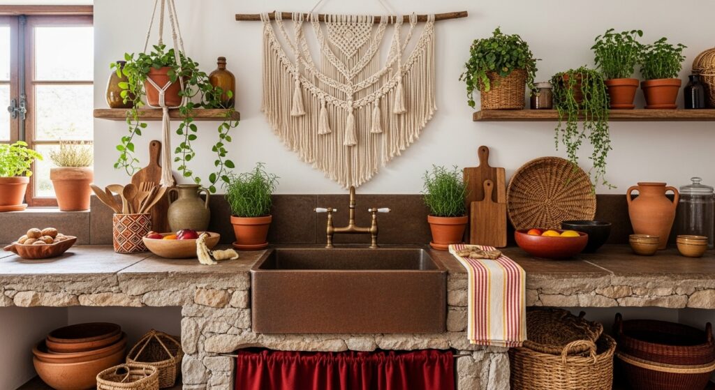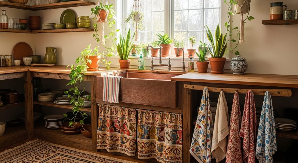 Elevate your sink setup with woven baskets, jute mats, and artisanal dish towels. These textures complete the free-spirited look.