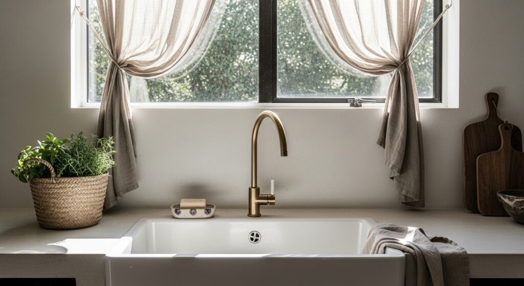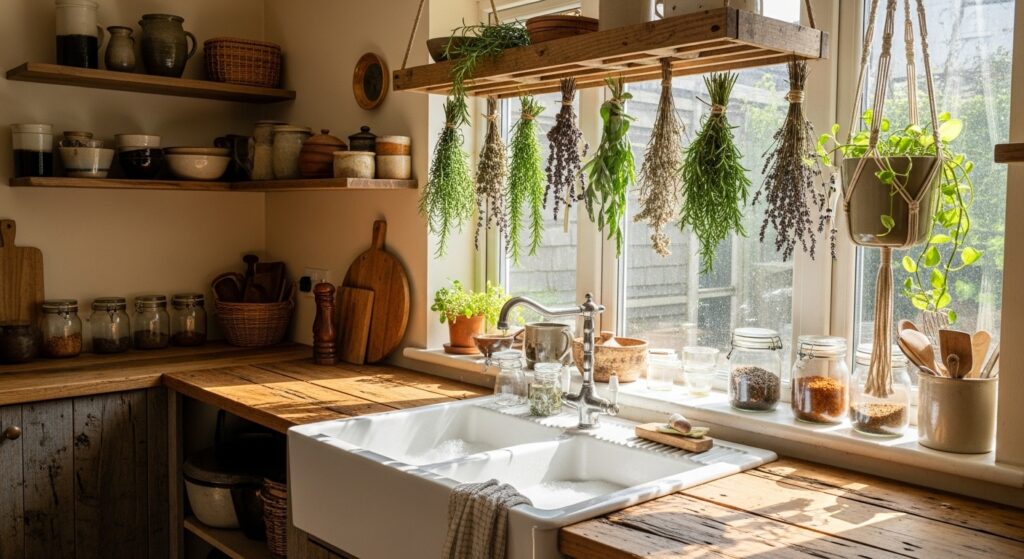 Dress your sink corner with handmade macramé curtains and hanging planters. It’s a creative, feminine twist on traditional kitchen styling.