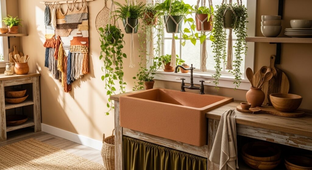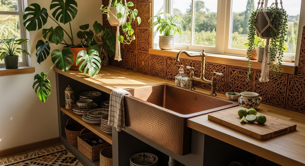 A brass vessel sink catches light beautifully, adding a sense of opulence to your boho kitchen. Pair it with green plants and soft lighting for a cozy vibe.