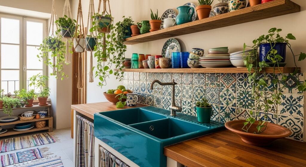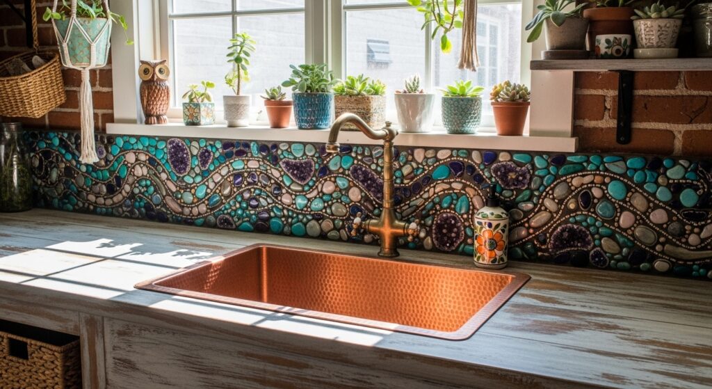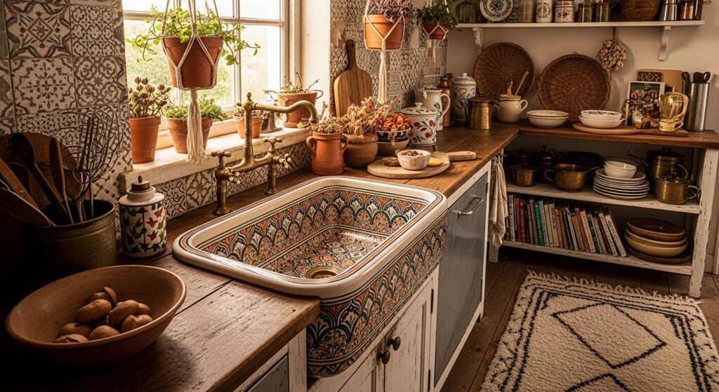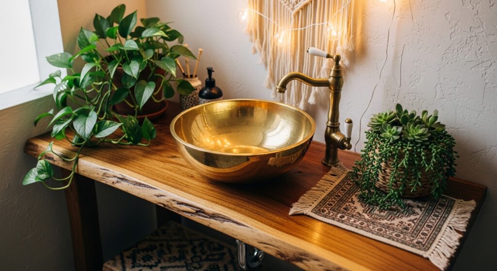 Blend cultural influences — Moroccan tiles, Indian brass, Mediterranean ceramics — to craft your own global boho sink story.