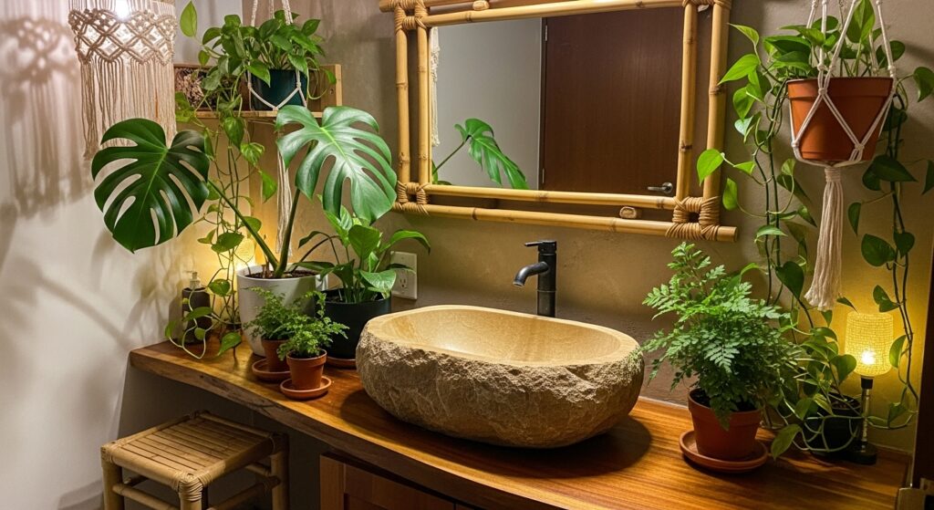 A carved stone sink evokes serenity and organic beauty. Its raw texture pairs perfectly with natural greenery and rattan details, creating a grounded boho vibe. Ideal for nature-inspired homes.
